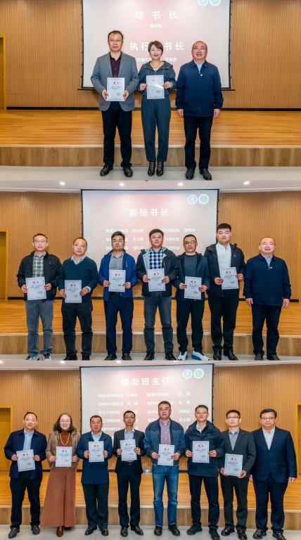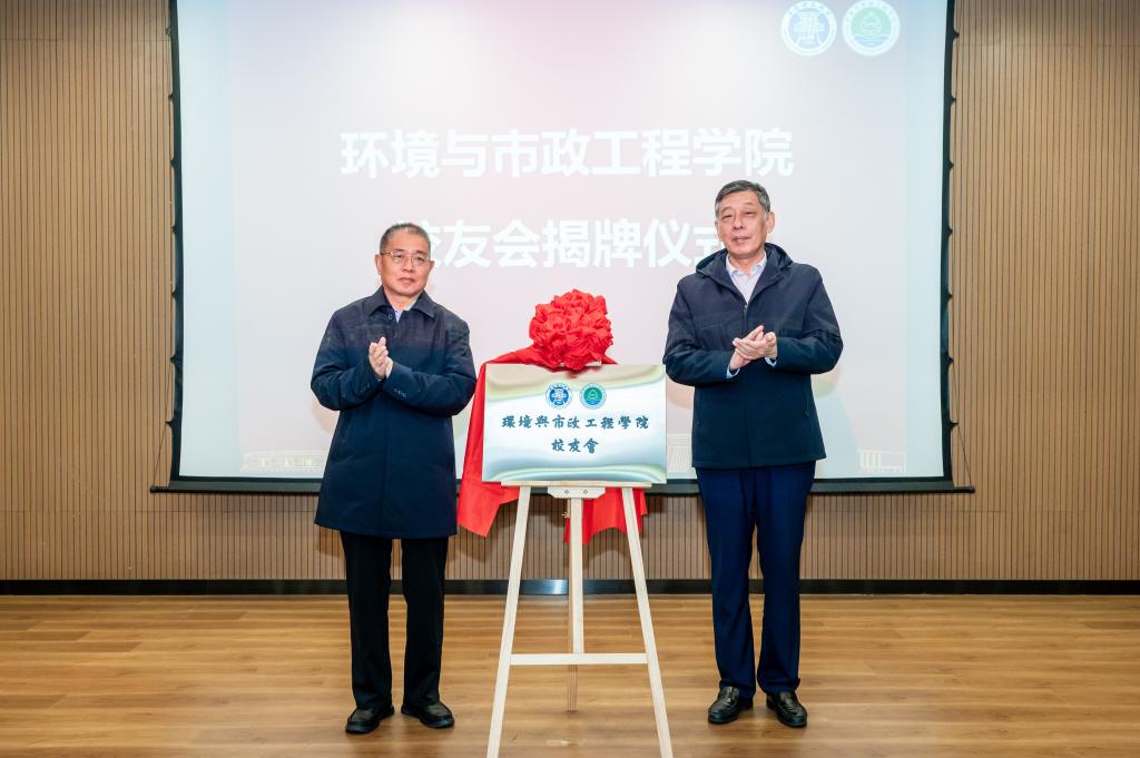水80级校友校友周善东、水81级杨兴昌共同为“环境与市政工程学院校友会”揭牌。陈伟等领导向首届校友会组织机构成员及校友班主任颁发聘书。