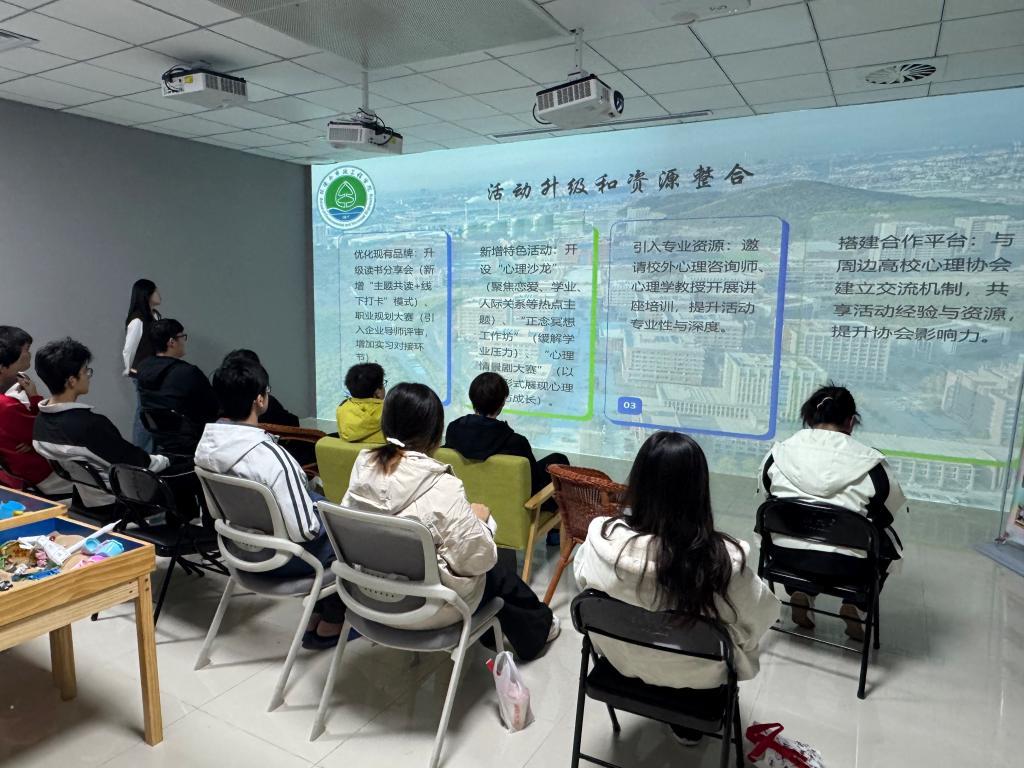 活动现场,绿蕊心理协会的成果宣讲区率先拉开帷幕。协会成员通过PPT的方式,全面展示了过去一年在心理健康科普、团体辅导等方面的丰硕成果。从“心理趣味运动会”到“朋辈志愿者培训会”,每一项成果都凝聚着协会的用心与专业,让在场学生直观感受到心理健康工作对校园生活的积极影响。宣讲过程中,成员们还结合实际案例,分享了心理健康的重要性及自我调节的实用技巧,引导大家关注自身心理状态,学会用科学的方式应对成长中的困惑。