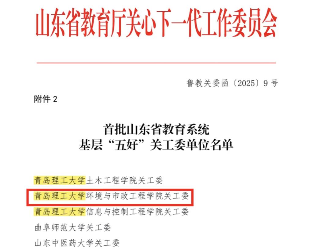 近日,山东省教育厅关心下一代工作委员会公布首批山东省教育系统基层“五好”关工委评选结果,环境与市政工程学院关心下一代工作委员会凭借其扎实的工作成效与鲜明的育人特色,获评首批“山东省教育系统基层‘五好’关工委”。