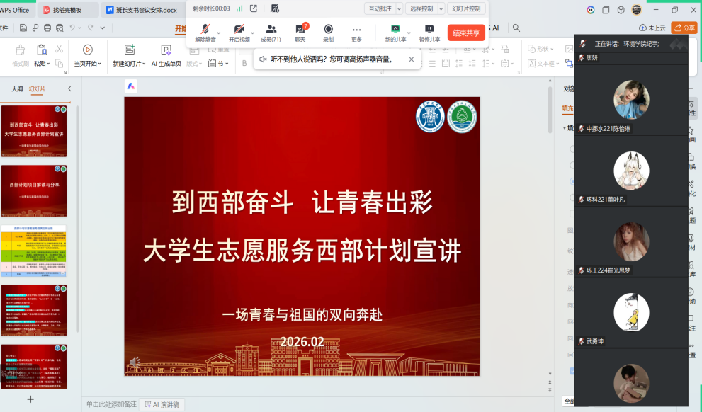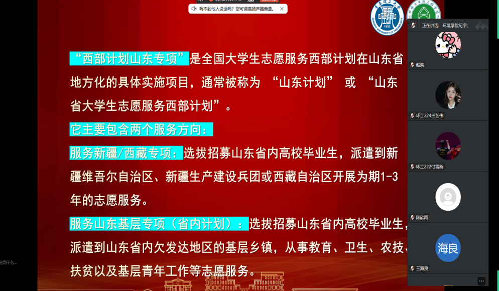 为深入贯彻落实大学生志愿服务西部计划工作部署,引导青年学子把个人理想融入国家发展大局,鼓励毕业生到基层、到西部、到祖国最需要的地方建功立业,环境与市政工程学院于寒假期间举办西部计划专题宣讲会。学院2022级辅导员纪宇、王玉雪,研究生辅导员宫克菲及有志于参与西部计划的学生齐聚云端,共话青春担当,共赴志愿之约。