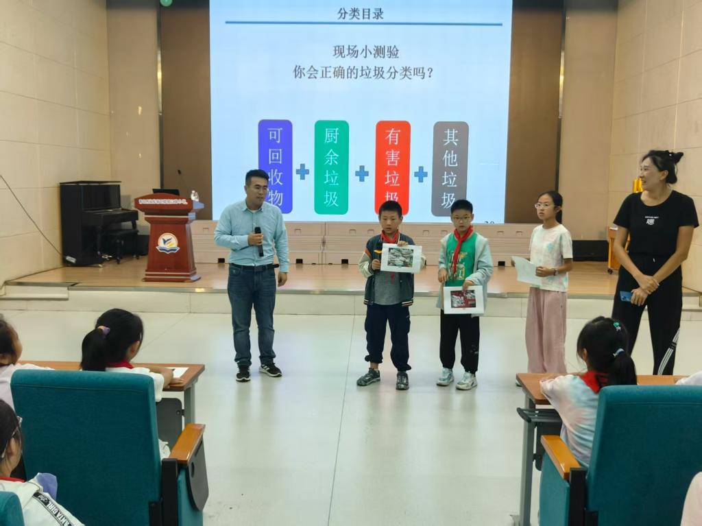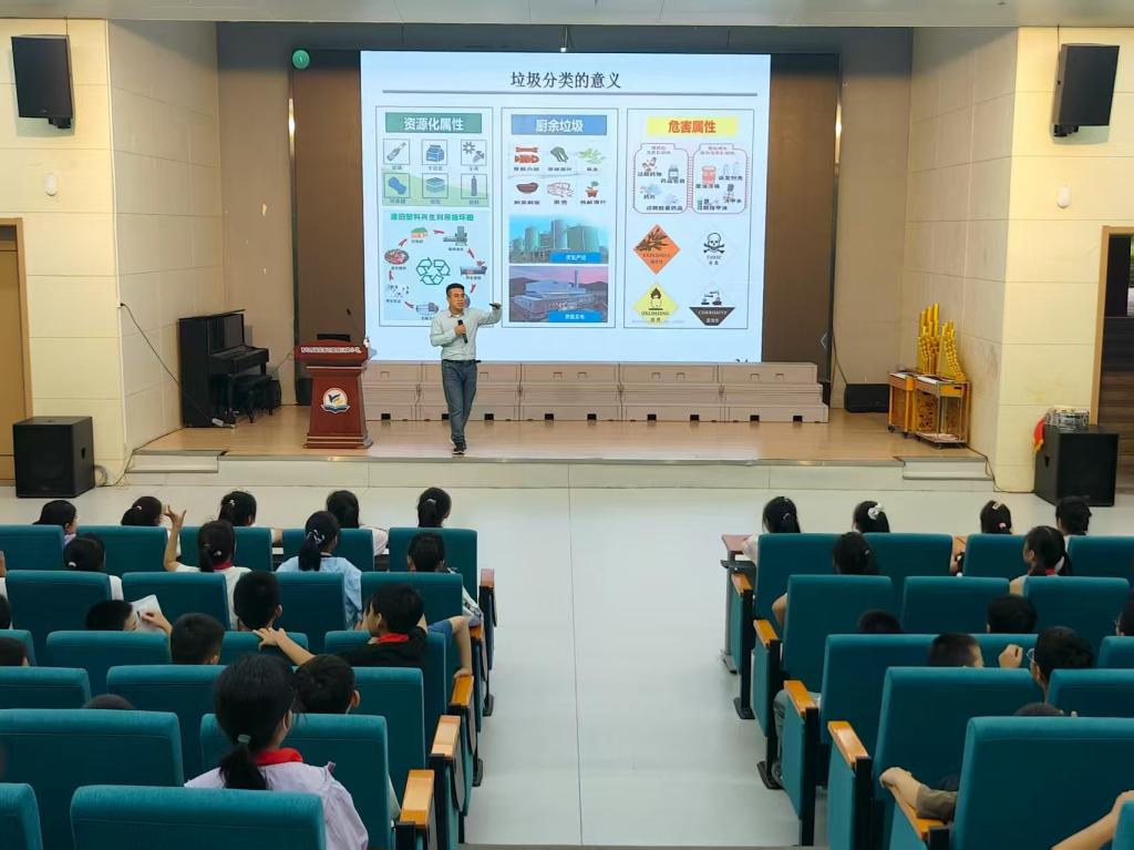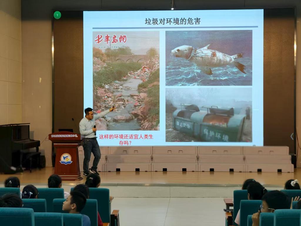 9月18日,嘉陵江路小学四年级师生齐聚报告厅,聆听青岛理工大学环境与市政工程学院教授、博士生导师、泰山学者青年专家王华伟带来的“做好垃圾分类,践行初心使命”科普讲座,鲜活的内容让环保理念深入人心。本次活动由王华伟教授携手“净蓝”环保志愿者协会共同策划举办,为学子们上了一堂生动的环保实践课。